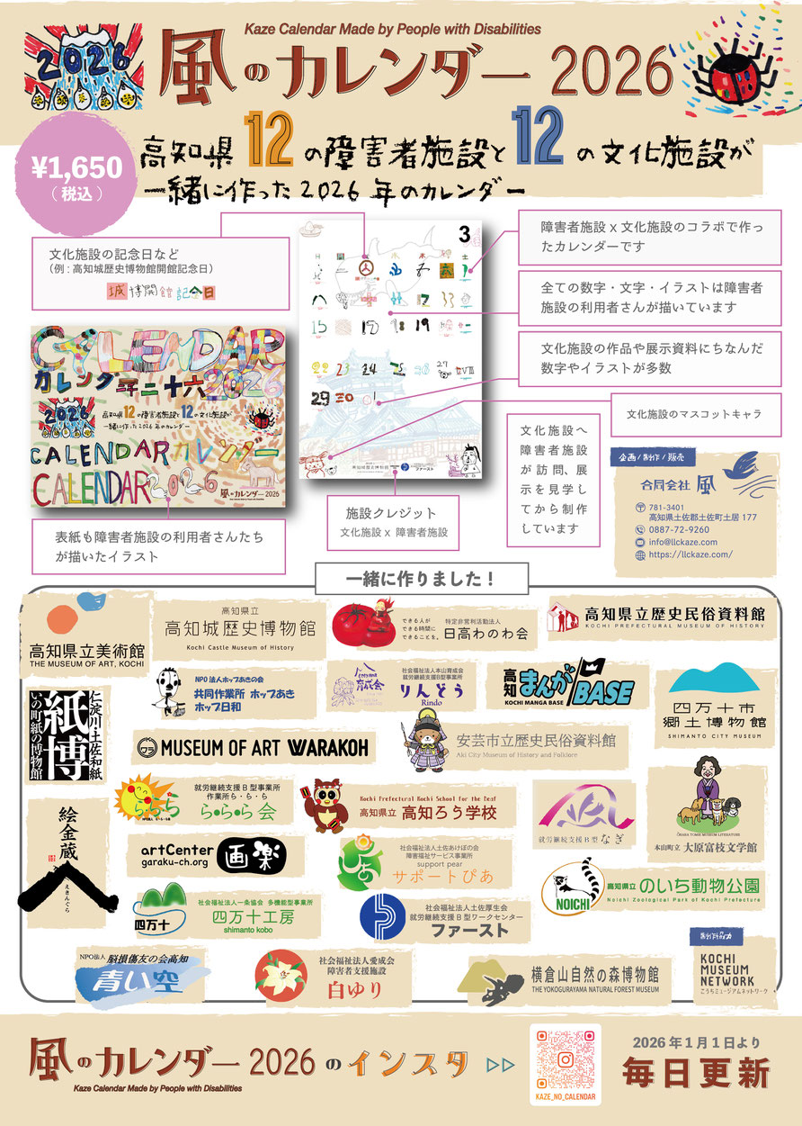 令和8(2025)年は、障害がある方と文化施設の交流・連携の機会にしたいとの提案があり、高知県12の障害施設と12の文化施設が一緒に2026年のカレンダーを制作することになりました。